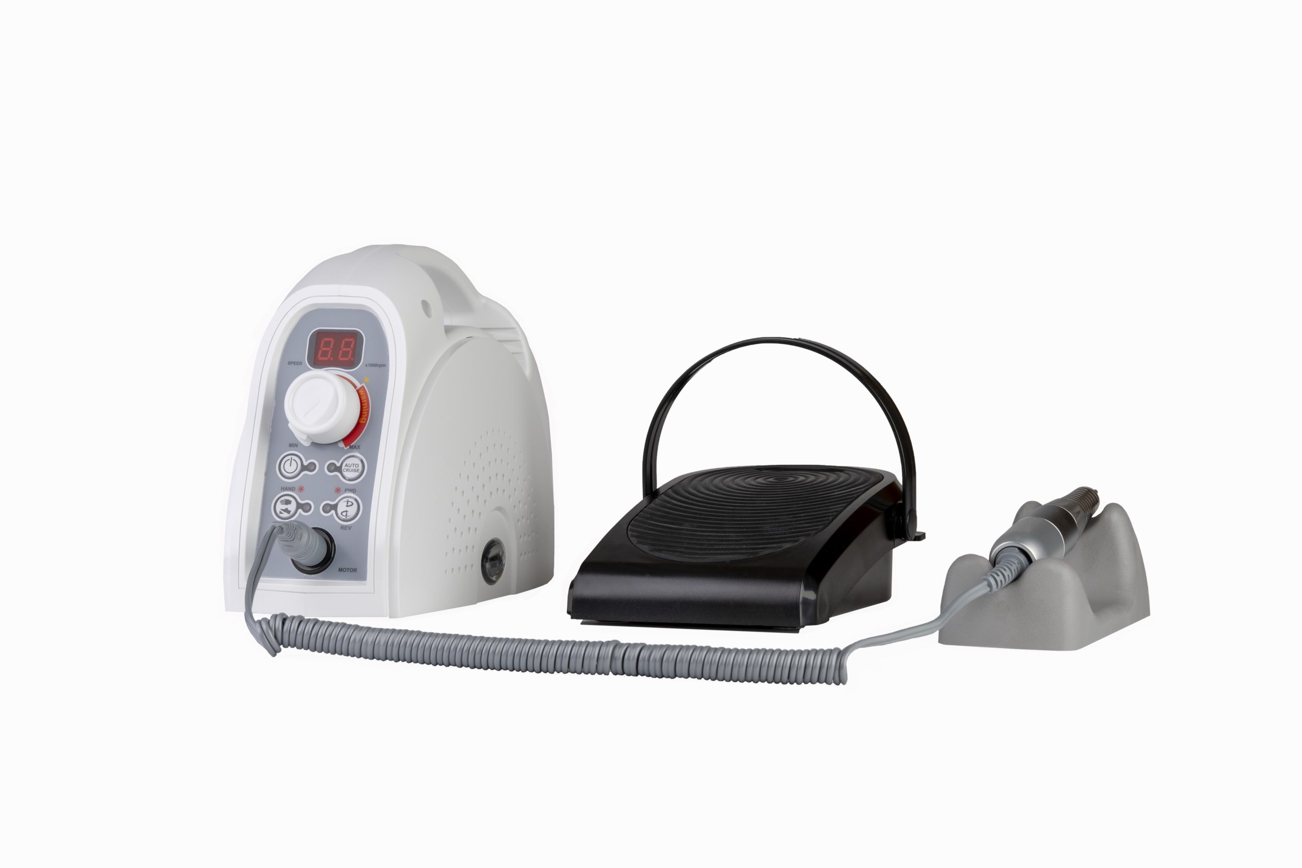 Trockenfräser, handliches Fräsgerät für Maniküre und Pediküre, auch gut für mobilen Einsatz geeignet, da eingebauter Tragegriff, bis 30.000 U/Min., Zusatzfunktion: kurzfristig bis 35.000 U/Min., Rechts/Linkslauf, Gewicht der Basisstation 1,8 kg, vibrationsarmes Edelstahl-Handstück mit speziellem Spannzangensystem für leichtes Auswechseln aller handelsüblichen Fräsaufsätze, inkl. Fußschalter. Memory-Funktion (die zuletzt verwendete Drehzahl wird beim Neustart automatisch eingestellt).