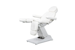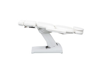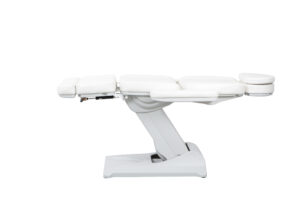 Preiswerte Fußpflegeliege mit 3 Motoren, um die Höhe, die Neigung der Rückenlehne und des Sitzes zu verstellen. Armlehnen beidseitig wegklappbar und abnehmbar. Verstellbare Kopfstütze mit Gesichtsausschnitt. Fußstützen mechanisch um 90° drehbar und mittels Gasfederhebel unabhängig voneinander in der Höhe regulierbar . Komfortable Polsterung mit strapazierbarem Bezug. LED Beleuchtung im Sockel.
