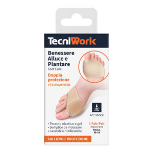 Fußschutz aus elastischem Gewebe mit zwei weichen Anti-Schock-Gel-Pads im Inneren, einfach und bequem anzulegen. Ideal, um dem Vorfuß Komfort und Wohlbefinden zu bieten und Reibung und Druck auf den großen Zeh zu vermeiden, ohne dabei aufzutragen. Auch geeignet für langes Stehen oder für Sportarten, die den vorderen Teil des Fußes belasten.