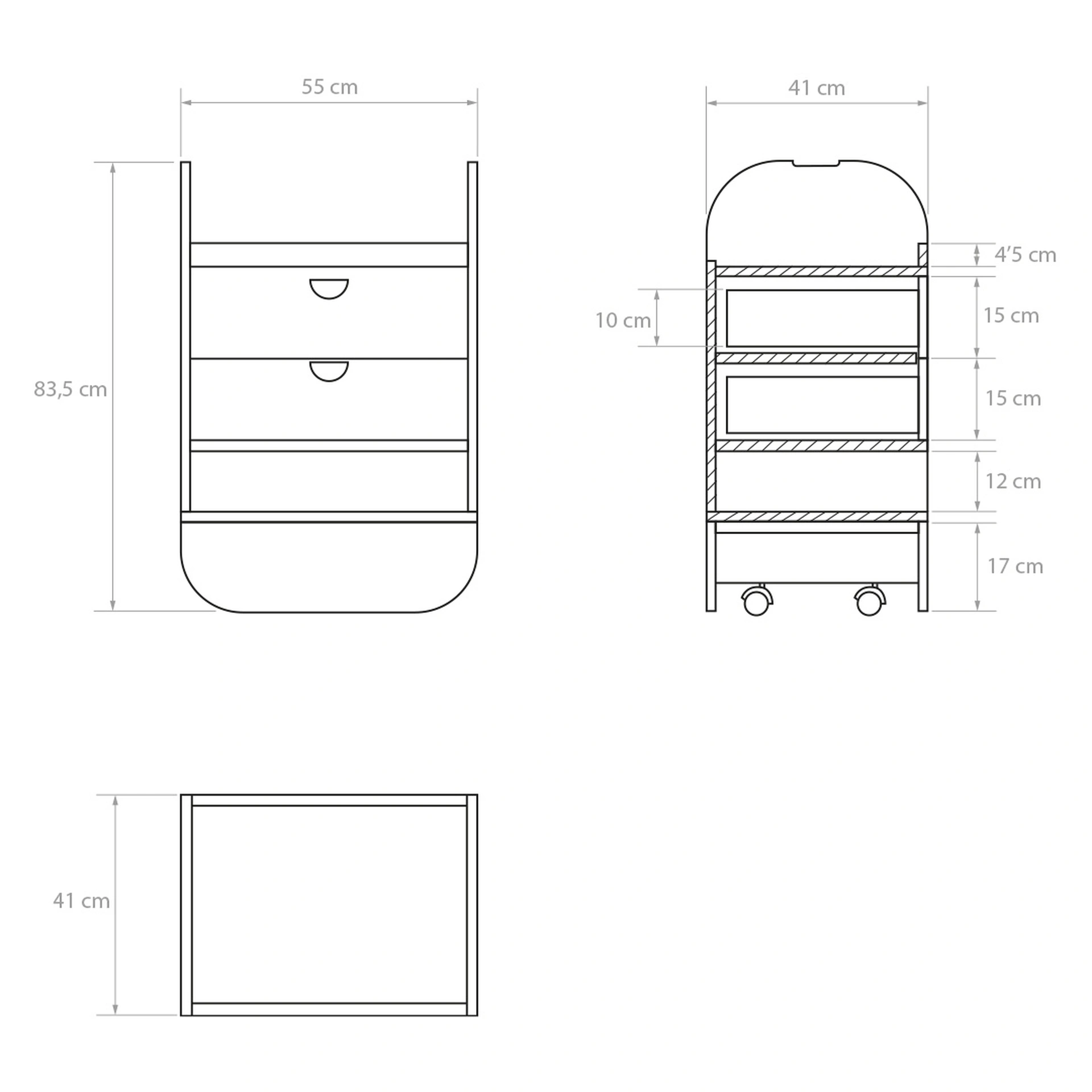 Dieser Wagen mit zwei Schubladen wurde entwickelt, um dich im dynamischen Alltag zu begleiten und die Ordnung und Sauberkeit von Arbeitsmaterialien und -utensilien zu erleichtern. Seine leichte, aber robuste Struktur zusammen mit hochwertigen Rädern mit 360°-Drehung garantiert eine reibungslose, leise und stabile Bewegung auch in anspruchsvollsten Umgebungen.
