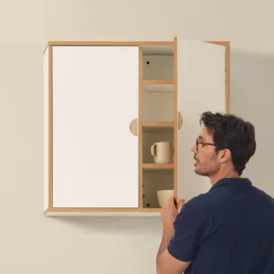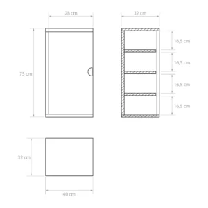 Er verfügt über drei Innenregale mit verstellbaren Höhen und ein Montagesystem, das die Montage der Tür in beide Richtungen ermöglicht, wodurch die Konfigurationsmöglichkeiten je nach Raumbedarf erweitert werden.