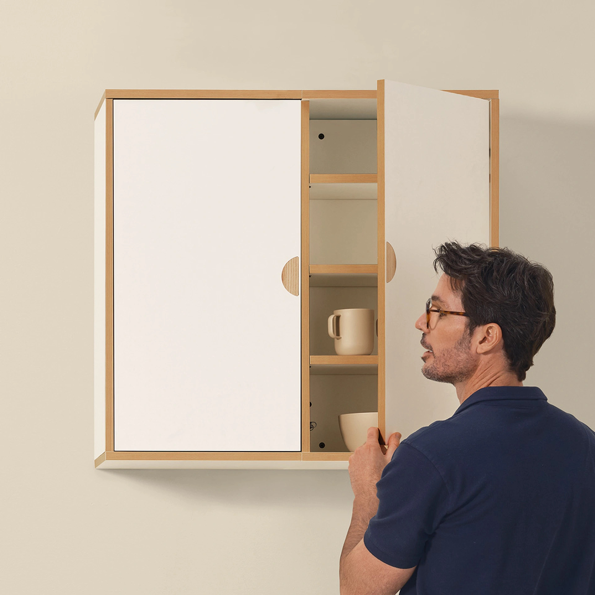 Dieses 40 cm breite Wandmodul mit drei Innenregalen ist die perfekte Lösung, um den benötigten Stauraum in Ihrer Umgebung zu erweitern. Es wurde so gestaltet, dass es sich an Ihre Bedürfnisse anpasst. Sie können so viele Module kombinieren, wie Ihr Raum erfordert, und eine maßgeschneiderte Komposition erstellen. Dank des Do-It-Yourself-Konzepts kann die Tür in beide Richtungen montiert werden, was unendliche Konfigurations- und Anpassungsmöglichkeiten bietet.