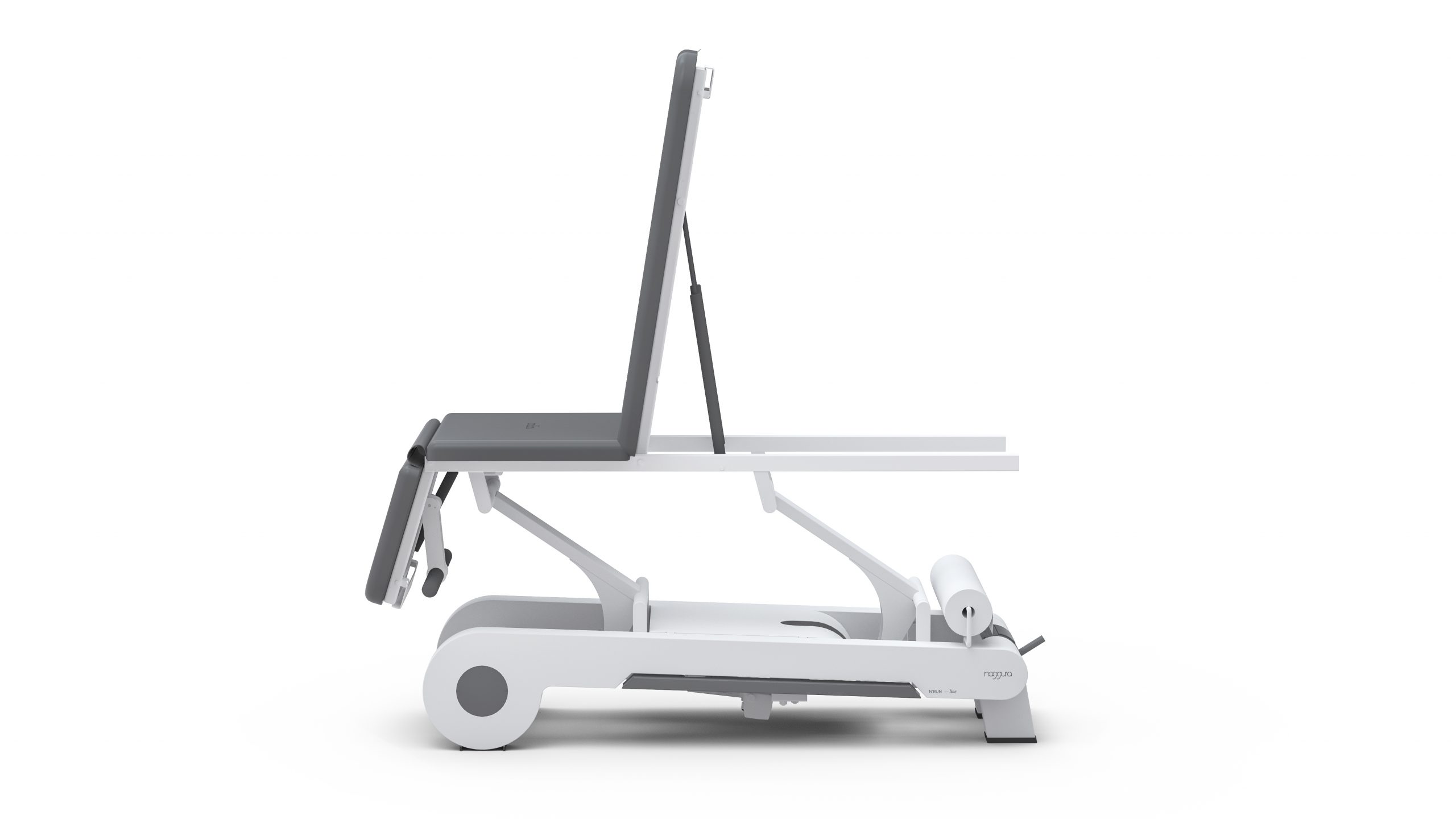 Elektrische dreiteilige Behandlungsliege, die durch ihre Flexibilität dank vieler verschiedenen Positionen hervorsticht. Zweimotorige Liege für die Höhe und Dachstellung, ideal für Physiotherapie.